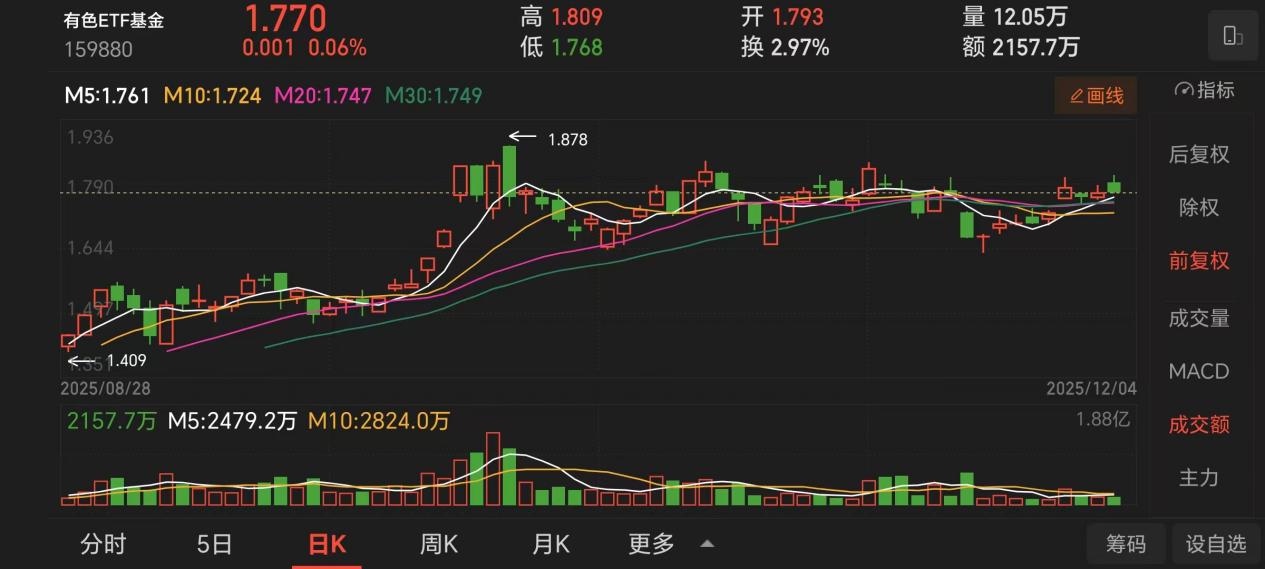 在此背景下,有色ETF基金(159880)通过全链路覆盖铜、铝、铅、锌、镍、锡等六大基础金属,实现了对工业金属价格波动的全景捕捉。其持仓结构采用“核心+卫星”策略,既包含铜铝等宏观敏感型品种,又配置锡锑等供需缺口明确的小金属,形成攻守兼备的资产组合。特别需要我们来关注的是,该ETF采用完全复制法跟踪中证有色金属指数,确保持仓透明度和流动性,日均成交额超2亿元,足以满足机构级资金配置需求。